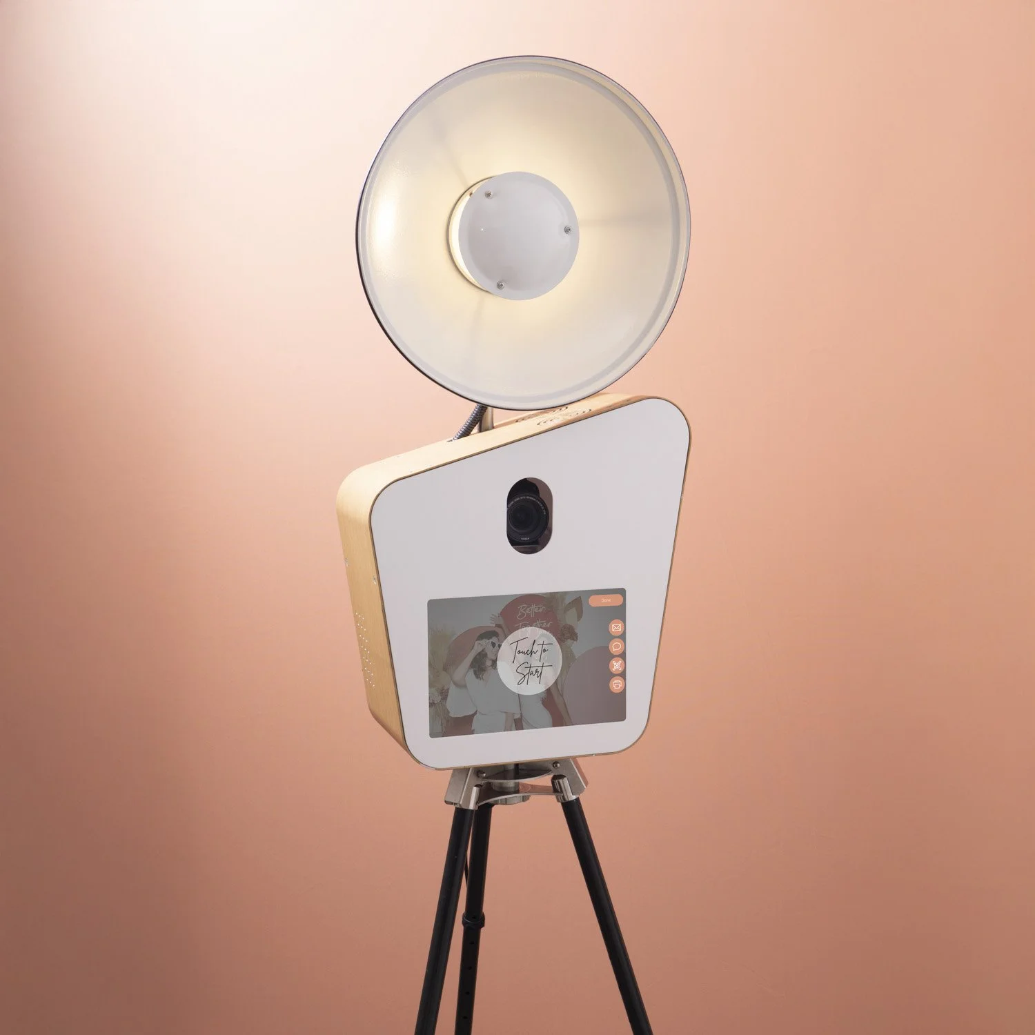 Our most booked booth and the ultimate crowd favourite. A modern open style photo booth with sleek studio lighting, custom backdrops and curated props tailored to your event. High quality instant prints, effortless digital sharing, and guaranteed dance floor energy.